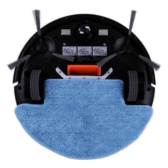 Ahora veamos la parte trasera del robot: dos ruedas motrices laterales, una rueda giratoria delantera, contactos de carga, un compartimento para la batería, dos cepillos laterales y un puerto de succión. En la parte inferior también hay una almohadilla con un paño de microfibra, por donde fluye el agua por gravedad desde el depósito.