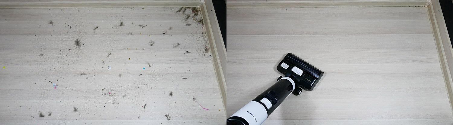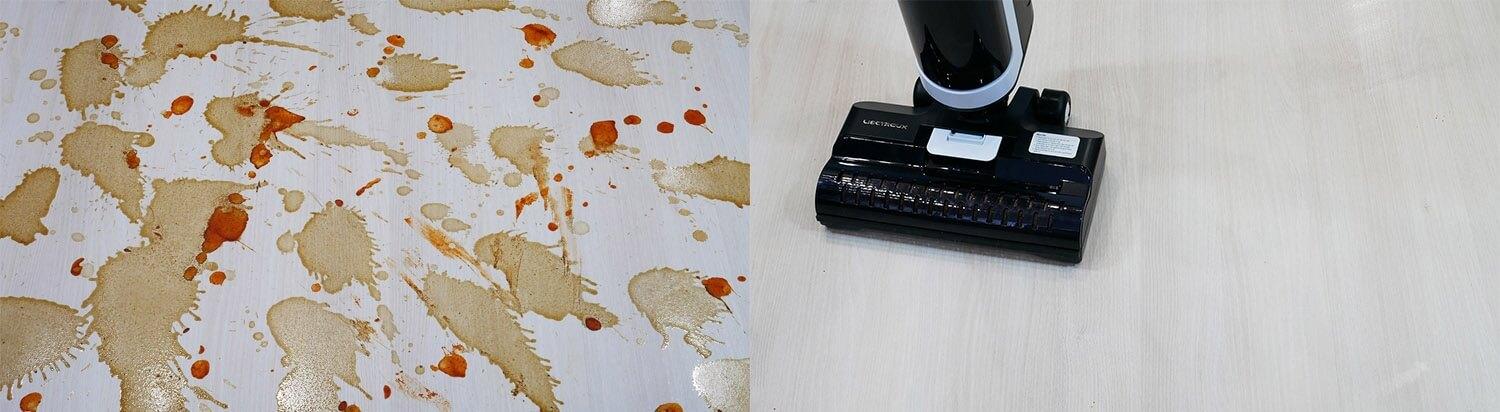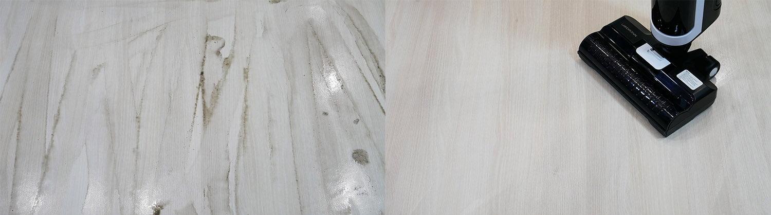 La Liectroux i7 Pro también se puede usar para limpiar la suciedad ligeramente seca del suelo. Como puede ver, no quedan marcas ni vetas. El suelo queda perfectamente limpio.