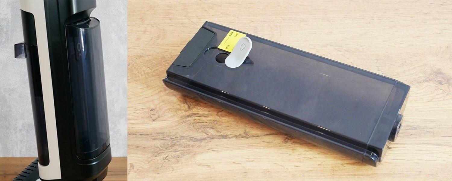 Un depósito de agua sucia de mayor capacidad se encuentra encima del módulo de limpieza. Tiene una capacidad de 800 ml. Contiene un filtro HEPA con malla y sensores electrónicos de nivel de agua. No incluye filtro grueso.