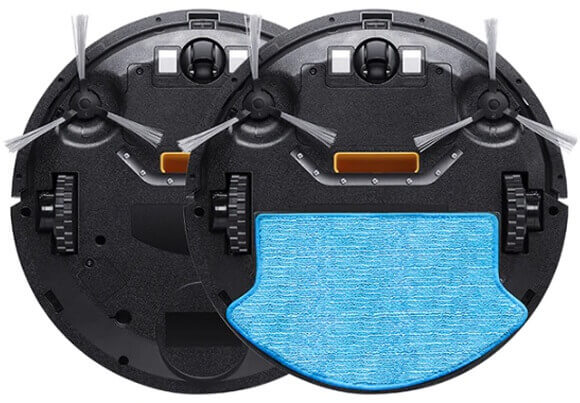 La base del robot aspirador cuenta con dos cepillos laterales rígidos de tres palas, una lámpara UV, un puerto de succión rectangular, un par de ruedas motrices de goma accionadas por motores eléctricos independientes, una rueda giratoria delantera, una tapa para el compartimento de la batería y contactos de acoplamiento. También se puede acoplar un paño de microfibra para limpieza en húmedo a la base, mientras que el contenedor de residuos sólidos se puede sustituir por un depósito de líquidos. Los sensores de detección de obstáculos y altura están montados alrededor del perímetro del robot.