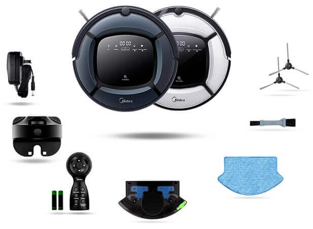 Los robots Midea VCR15 y VCR16 se suministran en un atractivo embalaje negro de marca con asa de plástico para facilitar su transporte. La caja contiene el robot y sus componentes, cada uno en una bolsa de plástico, en compartimentos separados.
