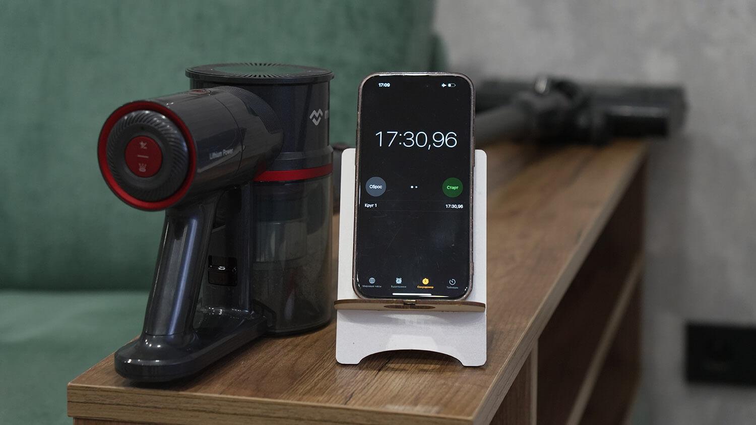 Finalmente, pasemos a las pruebas. Primero, comprobaremos la duración de la batería de la MIKO V11 en modo Turbo con la boquilla principal para suelos conectada. Logró 17,5 minutos de funcionamiento, un resultado muy bueno. Sin embargo, cabe destacar que tiene dos modos, no tres como sus competidores. Por lo tanto, este modo puede considerarse estándar en lugar de Turbo, lo que explica su mayor autonomía. A continuación, probaremos la potencia en este modo en la práctica.