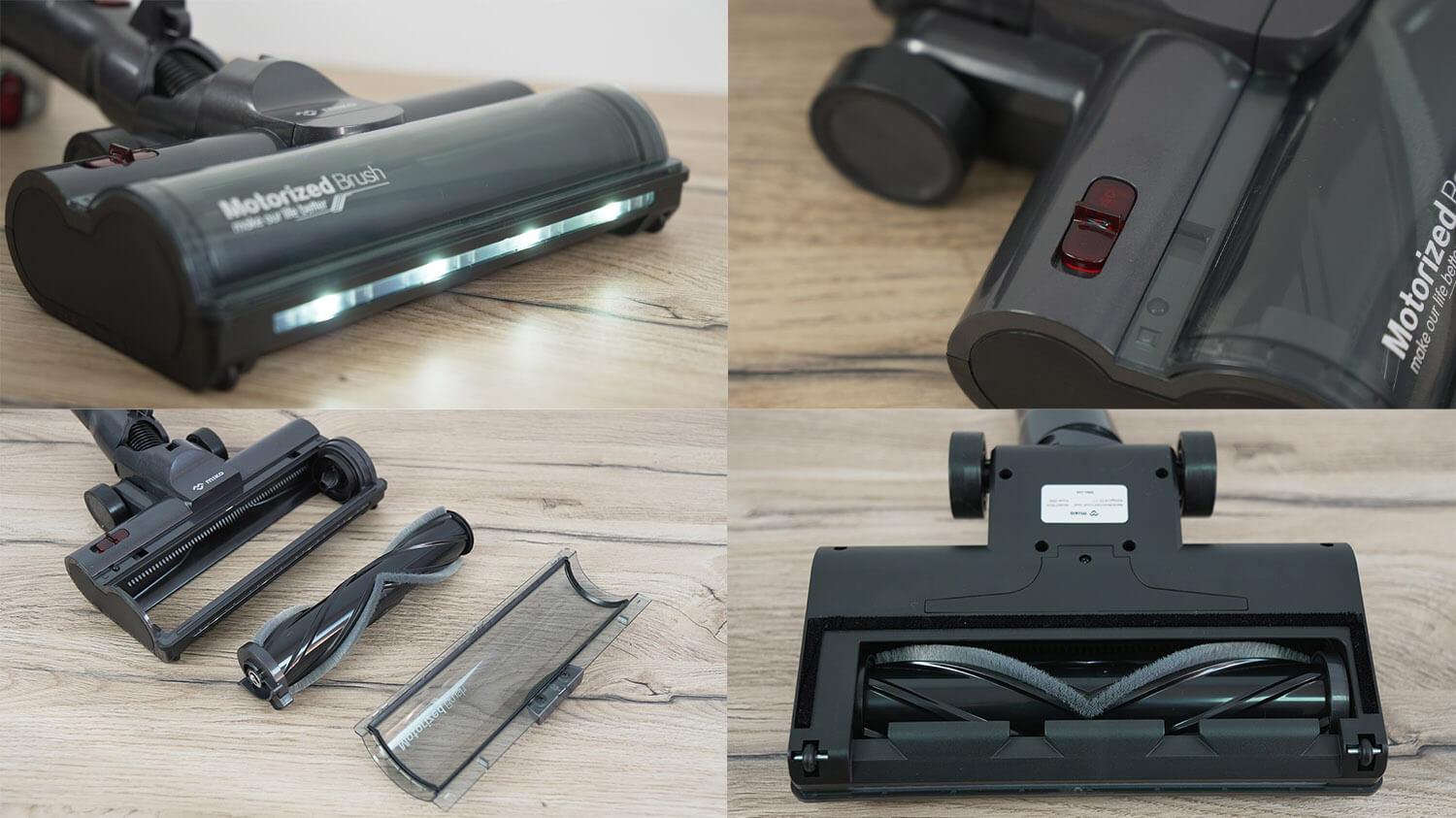La boquilla principal para suelos cuenta con una articulación giratoria. La cubierta superior es extraíble, dejando al descubierto un rodillo de cerdas cortas. Este diseño de rodillo es más versátil y ha demostrado su eficacia para recoger residuos tanto en suelos duros como en alfombras. Delante de la abertura de succión hay un peine para desenredar el pelo y el de las mascotas. Debajo, hay ranuras para residuos más grandes. Una luz LED frontal ilumina el área de limpieza, una ventaja adicional.