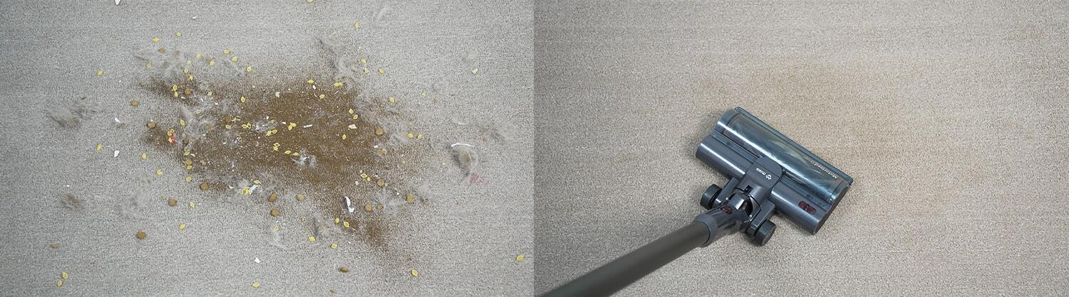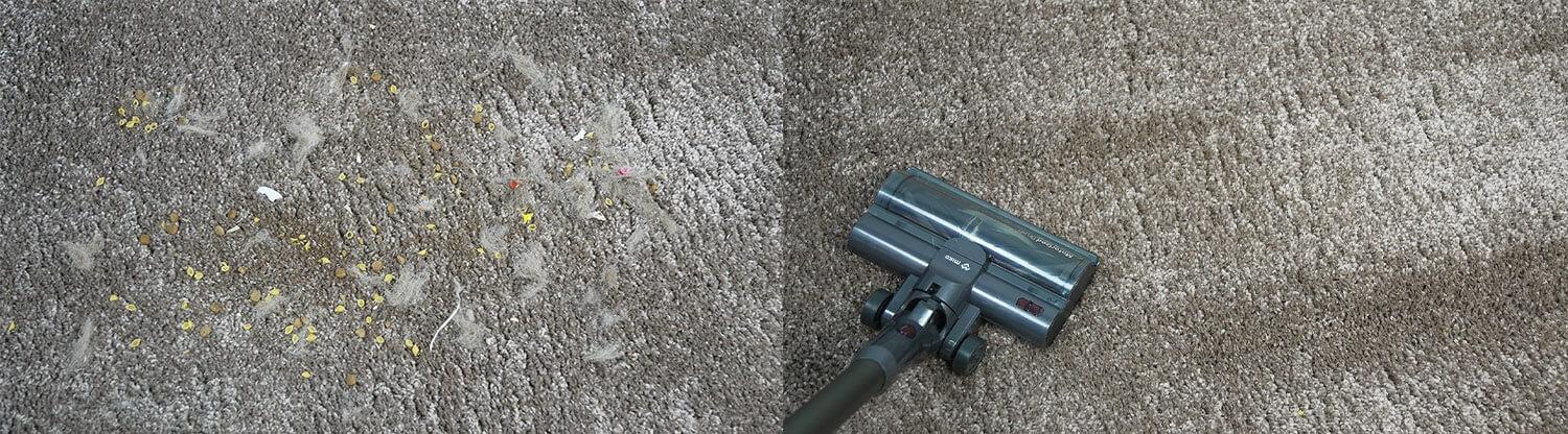 Los mismos residuos se esparcieron sobre una alfombra de pelo corto, y la Miko V11 funcionó igual de bien, limpiéndola a fondo. La aspiradora también limpió bien alfombras de pelo medio, sin bloquear el rodillo ni mostrar mensajes de error. ¡Esta prueba también fue superada!