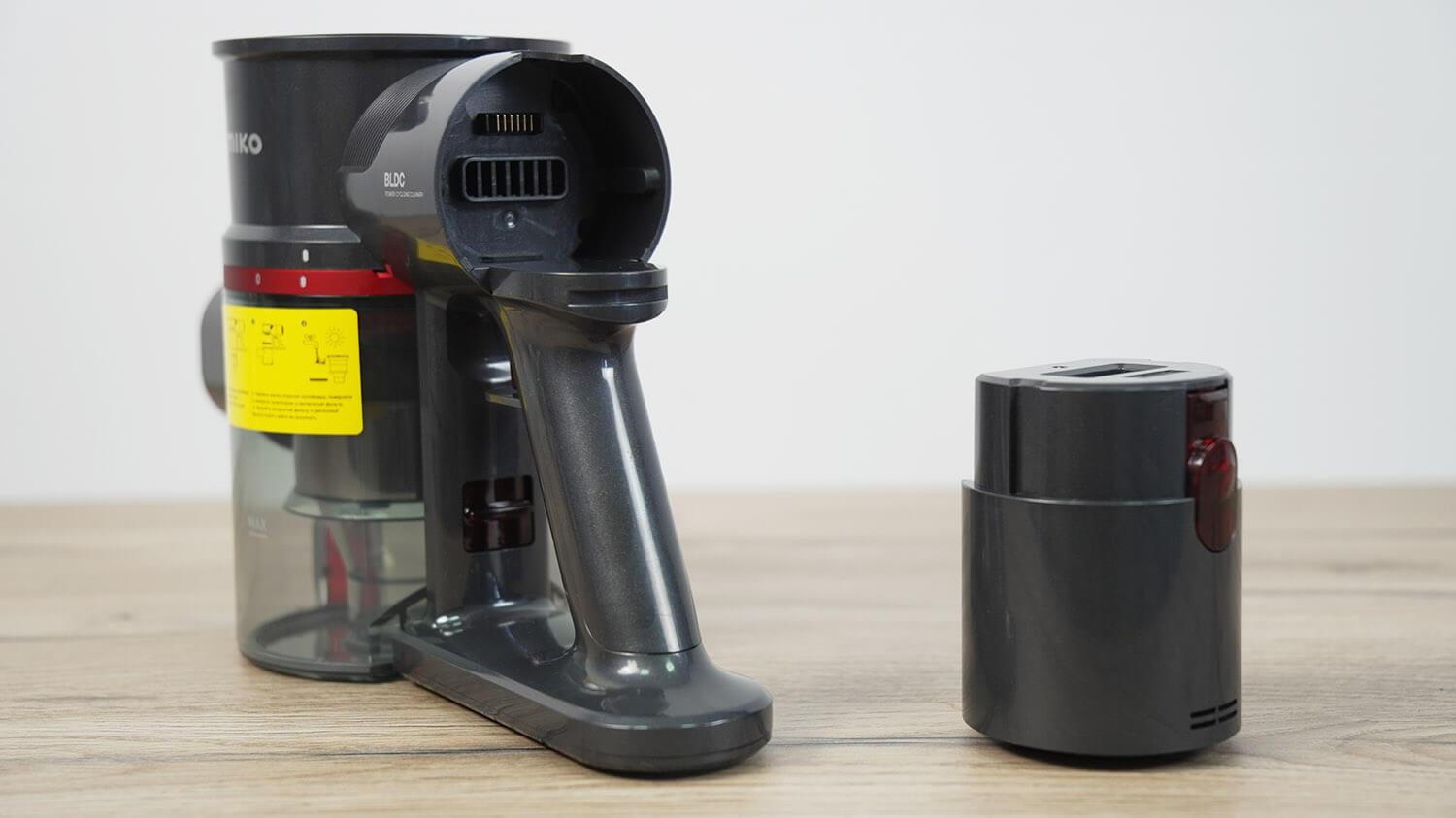Es muy conveniente que el colector de polvo del MIKO V11 sea extraíble, a diferencia de otros modelos V10 Y V12Un sistema de filtración basado en un filtro compuesto, un ciclón y una malla. Extraer el ciclón por el fondo del matraz no es la solución ideal, y les mostraré por qué en mis pruebas.