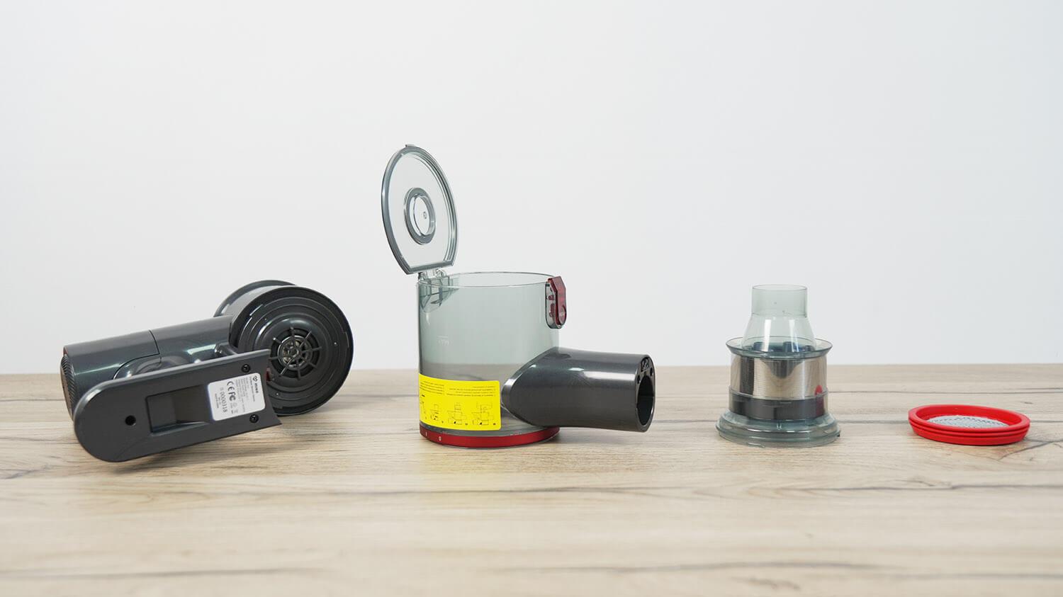 - El filtro ciclónico se extrae por la parte inferior del contenedor, lo que dificulta el vaciado del contenedor de polvo cuando debe realizarse manualmente.