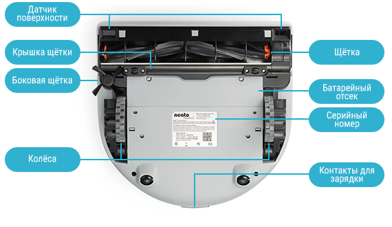 En la foto se muestra una descripción general del diseño del robot aspirador Neato Botvac D85: