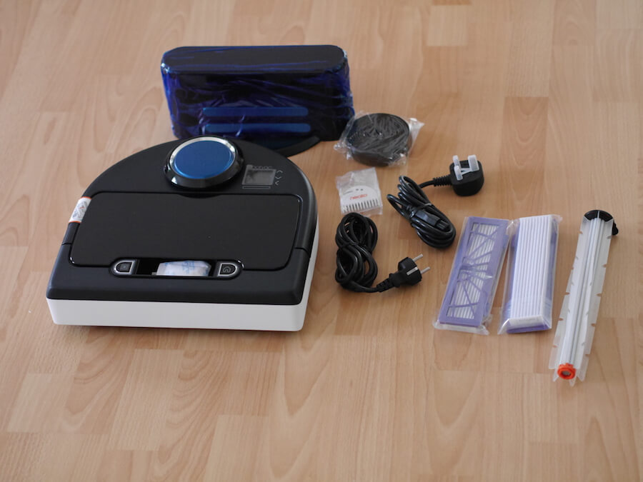 La foto muestra el conjunto completo de suministro del robot aspirador: