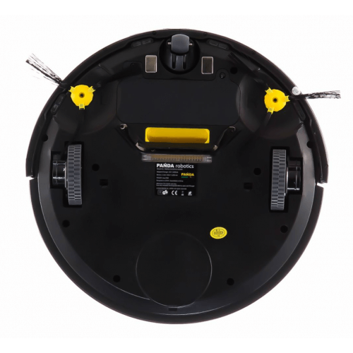 Una vista de la parte inferior del dispositivo revela la rueda delantera, que permite al robot aspirador Okami S80 navegar en cualquier dirección. A los lados de la rueda se encuentran los terminales a través de los cuales se carga el dispositivo desde la estación de carga. A los lados se encuentran los cepillos laterales, y en el centro de la parte inferior hay un canal de succión a través del cual se recogen los residuos. Junto a él se encuentra la tapa de la batería, y un paño de limpieza húmedo está fijado en la parte trasera.