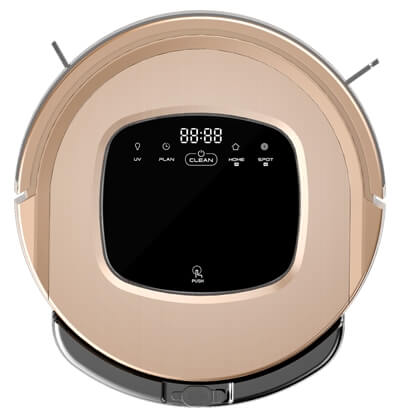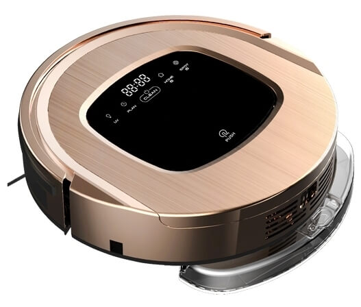 Una reseña del robot aspirador revela su diseño limpio y distintivo. El cuerpo del dispositivo está hecho de plástico resistente a los arañazos. El fabricante ha elegido los colores gris y dorado. El panel frontal cuenta con una tapa para el depósito de polvo. Esta tapa también sirve como pantalla para controlar el robot aspirador.