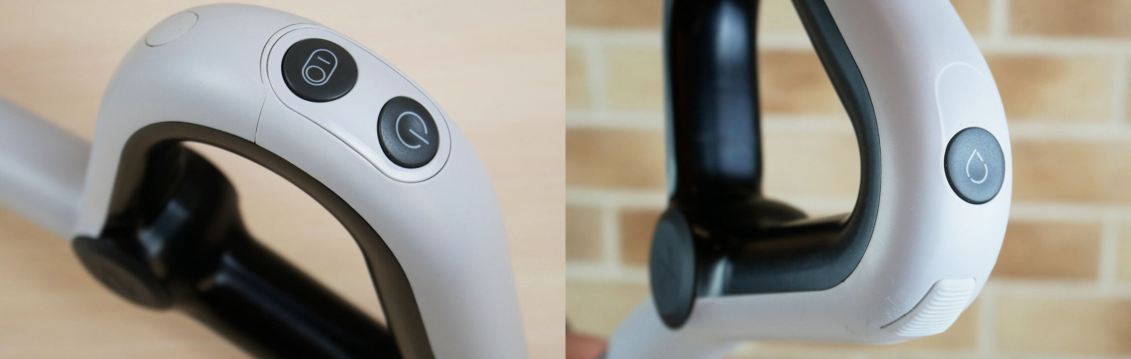 El mango de la aspiradora tiene tres botones de control mecánicos: encendido/apagado, cambio entre modos de limpieza (modo automático o Turbo) e inicio de la función de autolimpieza en la estación de carga.