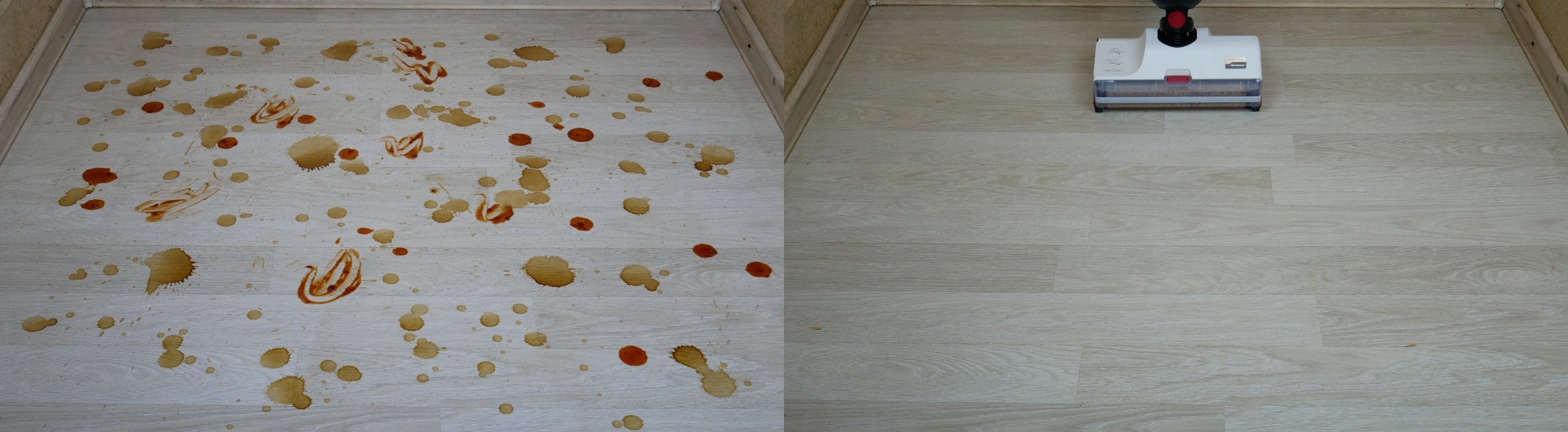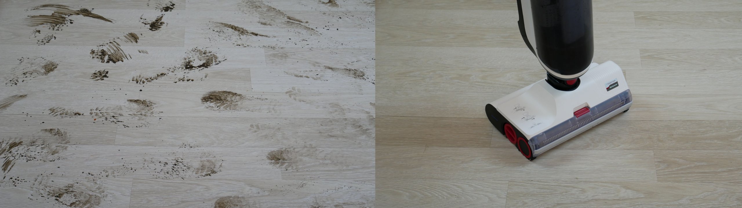 La aspiradora realiza eficazmente la limpieza diaria de pisos. En modo automático, ajusta automáticamente la potencia de succión según el grado de suciedad del piso. El líquido se aspira completamente en el depósito de agua sucia, sin dejar marcas ni charcos.