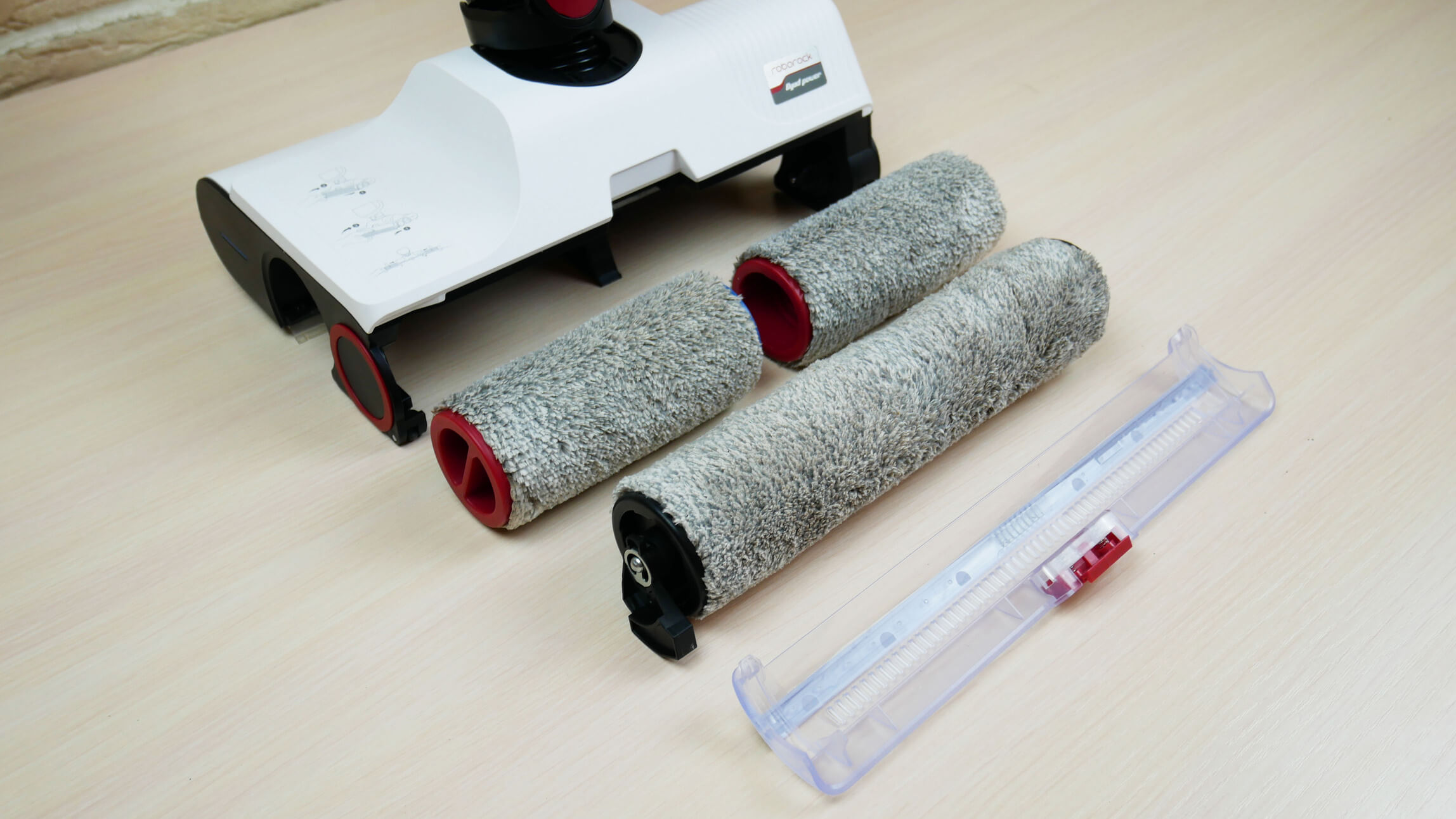 Empecemos por el módulo de limpieza. Cabe destacar que su sistema de tres rodillos no solo es único, sino también más eficaz que el de la mayoría de las aspiradoras inalámbricas. Los dos rodillos traseros se extienden hasta el borde de la unidad. Esto permite que la Roborock Dyad limpie eficazmente zócalos y muebles.