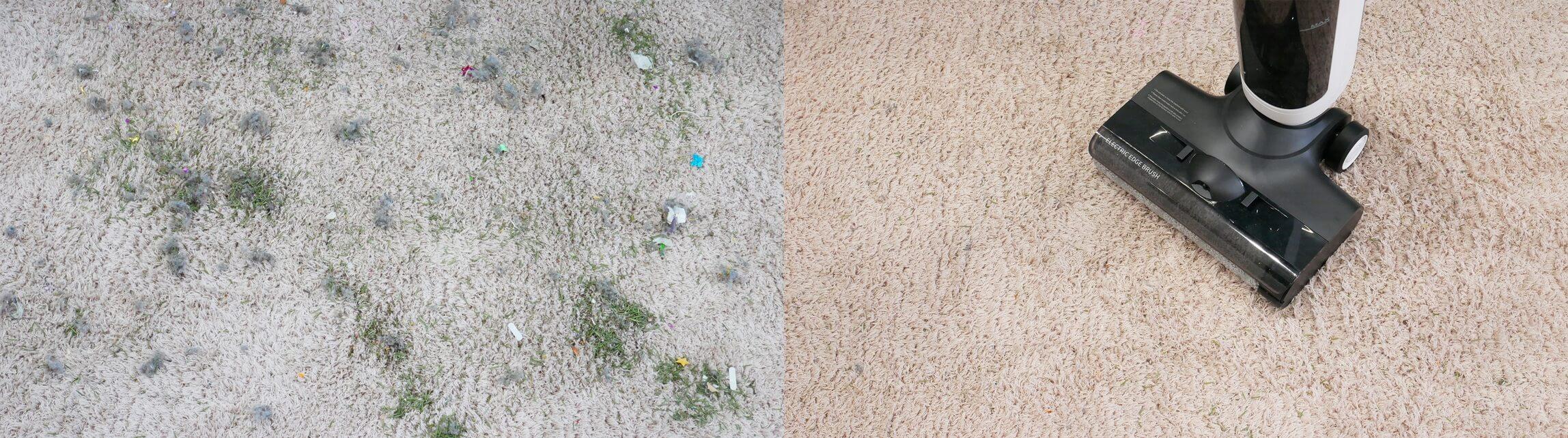 Aunque el kit no incluye un rodillo específico para alfombras, puedes limpiarlas con el rodillo esponjoso. Simplemente no llenes el depósito con agua ni selecciones el modo de succión de líquidos para evitar que el agua llegue al rodillo.