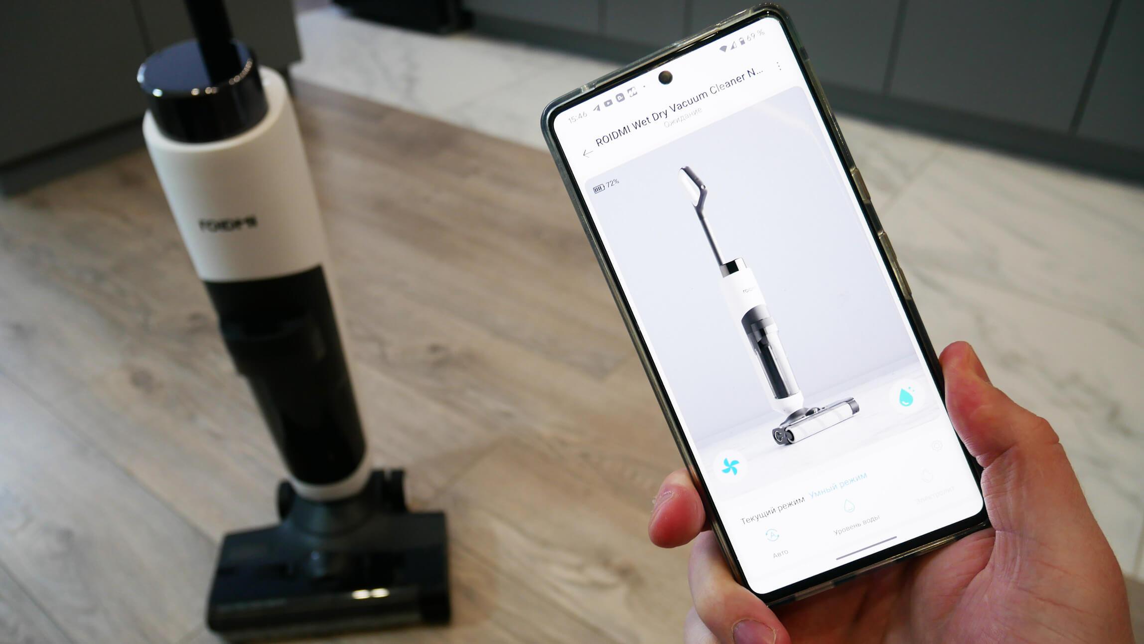 También me gustaría destacar las funciones de la app ROIDMI NEO. Esta aspiradora inalámbrica se controla mediante la app Mi Home. Puedes activar la función de secado con rodillo o la esterilización de agua cuando la aspiradora está en la base. El panel de control principal también muestra el modo de funcionamiento seleccionado y el nivel de batería. En la sección de ajustes, puedes desactivar la función de secado con rodillo, restablecer la configuración, seleccionar el idioma y el volumen de las notificaciones de voz, ver las estadísticas de limpieza y consultar las recomendaciones del fabricante. No hay nada que mejore el rendimiento de la limpieza, solo ajustes adicionales.
