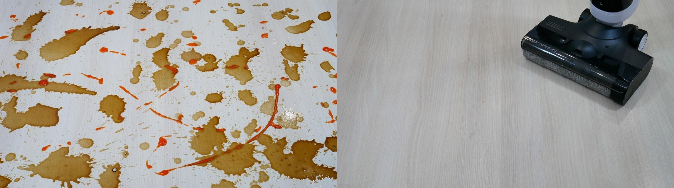 Esta aspiradora incluso eliminó manchas difíciles y secas de café y salsa. Al igual que con productos similares, tardó un poco en eliminar las manchas de salsa, unos 6 minutos en mi caso. No usé detergente, ya que el fabricante no lo incluye. Incluso con agua limpia, la ROIDMI NEO funcionó tan bien como la competencia. Es muy práctico poder rociar primero las manchas difíciles con agua y luego dejarlas en remojo un rato mientras se enjuagan otras áreas. Esto facilita mucho su eliminación.