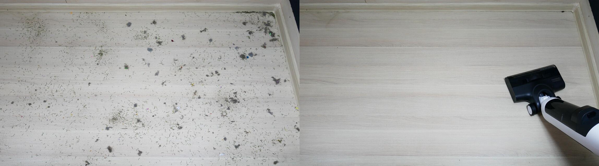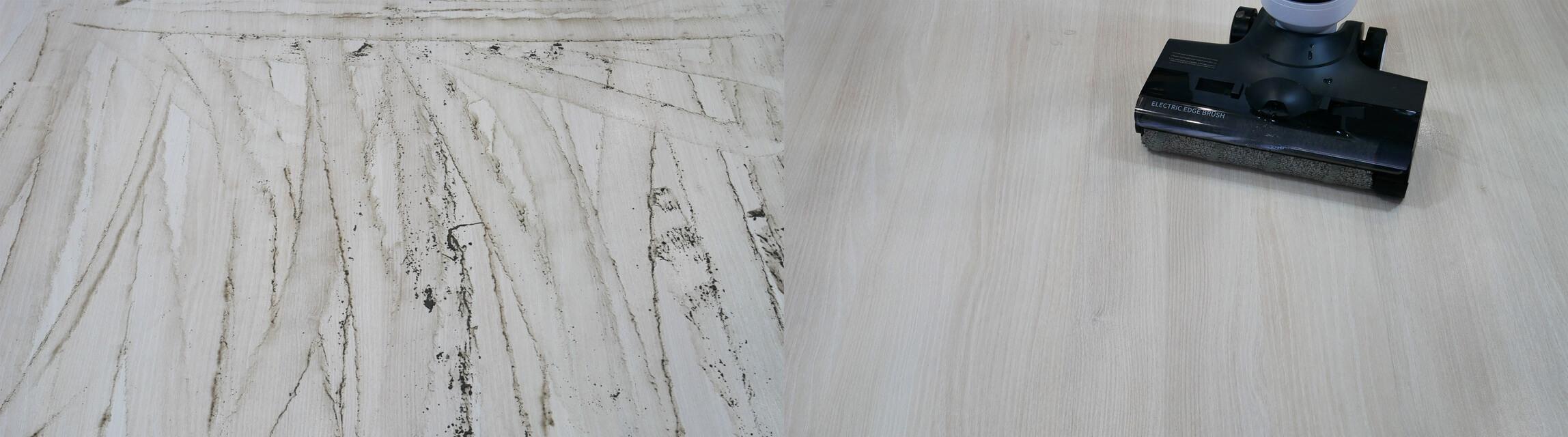 El ROIDMI NEO también se puede usar para limpiar suciedad ligeramente seca del suelo. Vemos que no quedan marcas ni vetas. El suelo está perfectamente limpio. El único problema es que el rodillo no llega hasta el borde del mueble, dejando una franja muy estrecha de unos pocos milímetros a lo largo del zócalo. Rociarlo con agua y luego limpiar el líquido del suelo puede solucionar el problema. Sin embargo, esto no es una solución. Los ingenieros aún tienen trabajo por hacer.