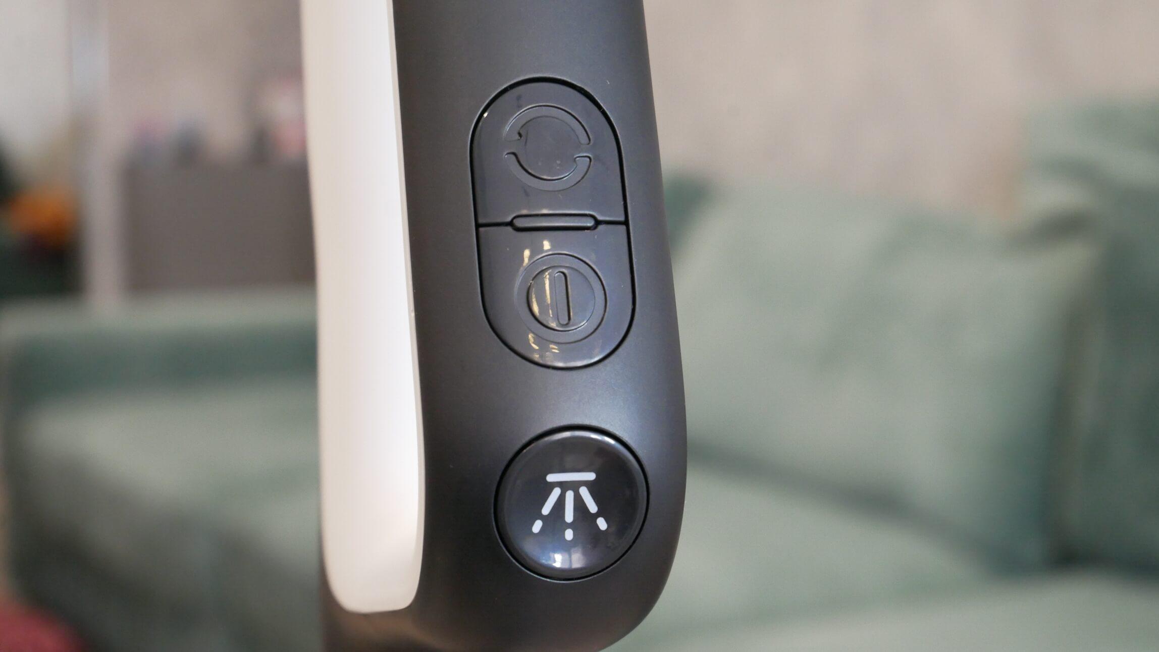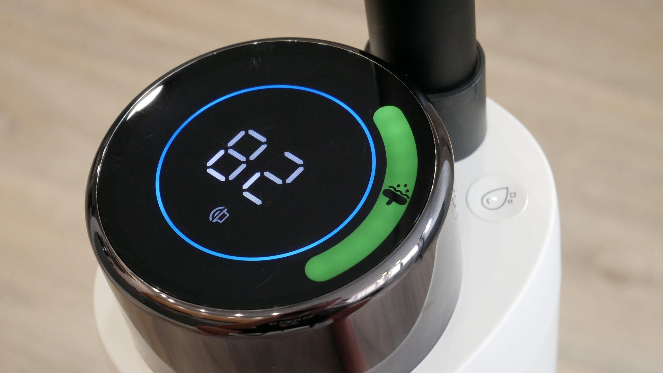 La parte superior del cuerpo cuenta con una gran pantalla informativa que muestra la carga de la batería, el modo de funcionamiento seleccionado y los mensajes de servicio. Hay tres modos de funcionamiento disponibles: Modo Inteligente, en el que el ROIDMI NEO aumenta automáticamente la potencia de succión al detectar suciedad; Modo de Succión de Líquidos sin agua; y Modo de Esterilización de Agua.
