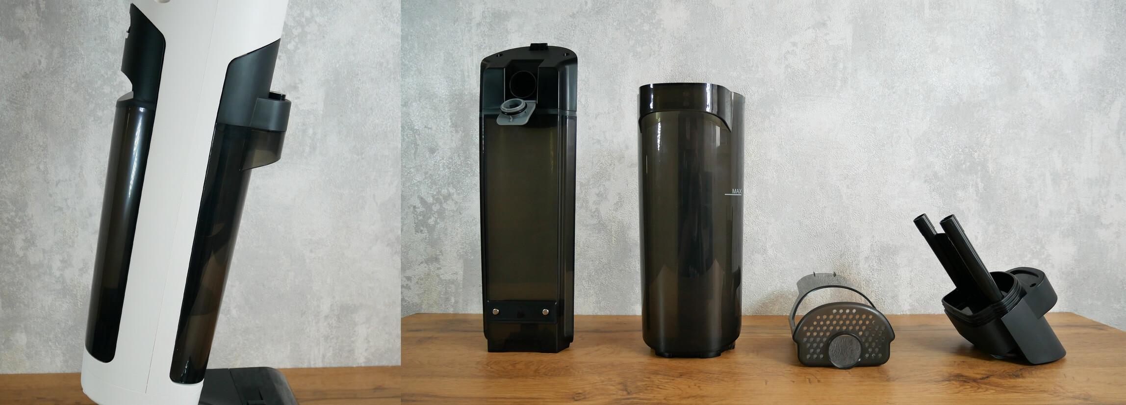 Un depósito de agua sucia de 690 ml se encuentra encima del módulo de limpieza. Contiene un filtro HEPA con malla. El sistema de detección del nivel de agua sucia, mediante sensores ópticos, está ingeniosamente implementado. También hay un filtro grueso dentro del depósito.