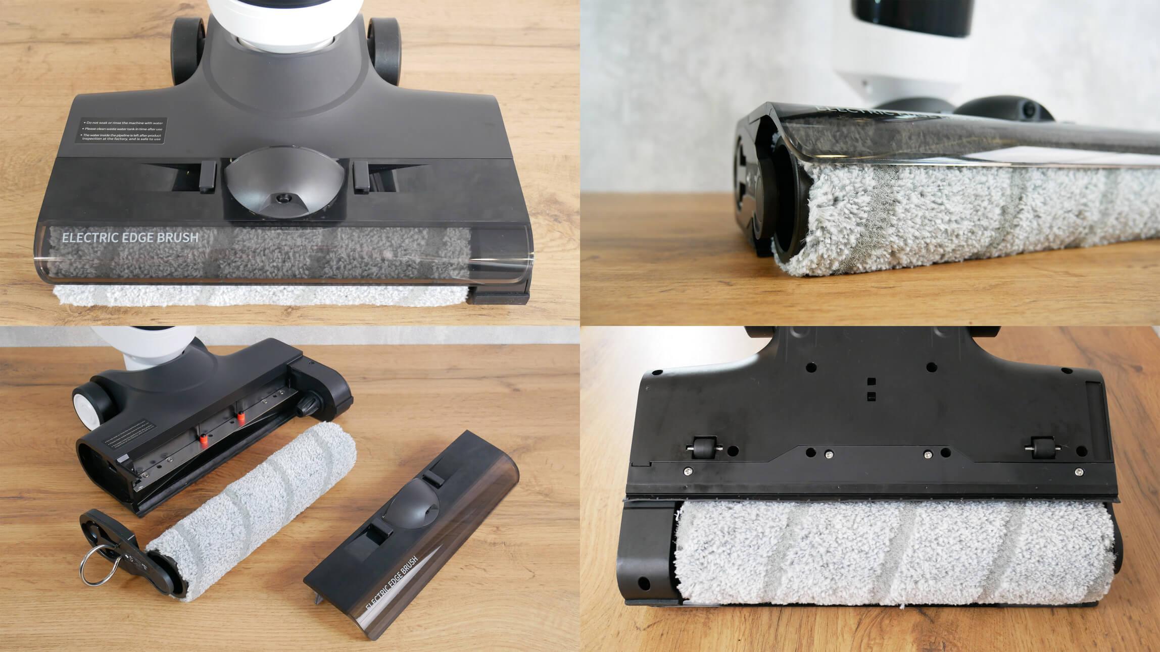 La cubierta superior es extraíble. El rodillo se extrae lateralmente. El pestillo no es extraíble, lo cual no es ideal. Te mostraré por qué en mis pruebas. Detrás del rodillo hay una escobilla de goma para recoger el agua residual del suelo, además de una toma de succión.