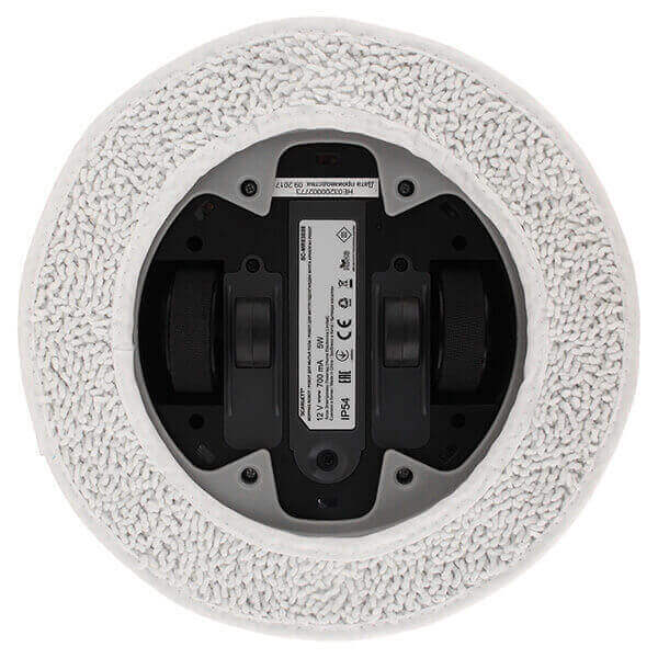 Al revisar el robot, observamos que la parte central del cuerpo, que contiene el botón de control, está rodeada por un recipiente plano, transparente y redondo para limpieza en húmedo, equipado con un tapón de llenado especial y dos mechas para humedecer un paño blanco. Esta parte también contiene una toma para conectar el adaptador de corriente.