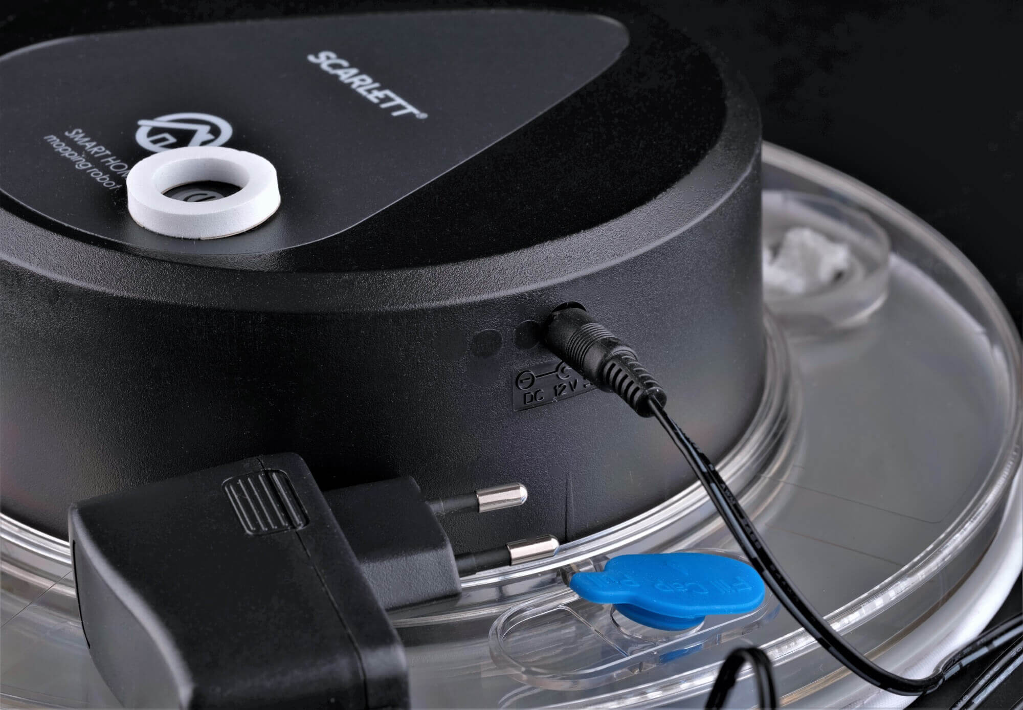 Para limpiar el suelo, el paño se fija a la base del dispositivo mediante cierres de velcro. El depósito se llena de agua y se puede añadir un detergente especial. El líquido se libera en pequeñas cantidades sobre el paño a través de dos orificios con mechas. El manual de usuario prohíbe que la Scarlett SC-MR83B99 recoja líquido del suelo o limpie charcos. Sin embargo, el robot aspirador no deja charcos tras su uso, ya que el líquido del depósito se usa con moderación y el paño está húmedo, pero no empapado.