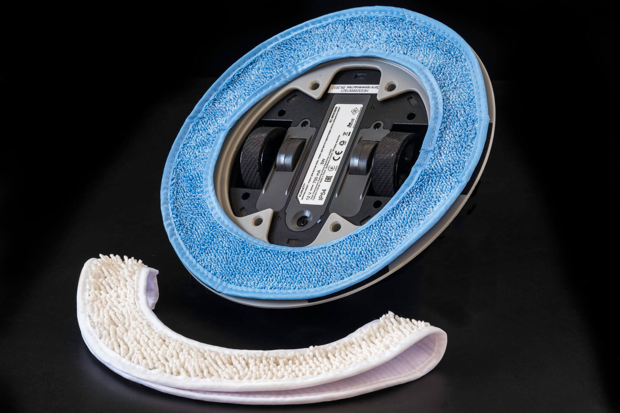 Al observar la pulidora desde abajo, se observan ruedas grandes y resistentes de goma, así como ruedas pequeñas y lisas para un mejor agarre en superficies lisas y blandas, tres pares de sensores anticaídas y un compartimento para la batería. Uno de los dos paños está fijado al fondo del depósito de líquido mediante un velcro especial.