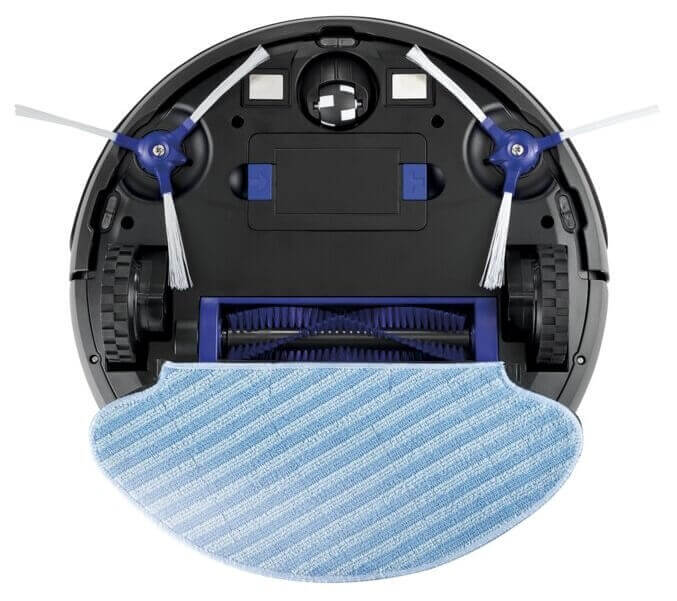 La parte trasera del robot aspirador contiene las ruedas motrices, una rueda giratoria delantera, almohadillas de contacto para la recarga automática del dispositivo en la estación de carga, un compartimento para la batería, sensores de desnivel, dos cepillos laterales y un cepillo turbo principal. Se puede acoplar una almohadilla de limpieza de suelos en la parte inferior. Esta almohadilla debe humedecerse manualmente, ya que no dispone de un depósito independiente con suministro automático de agua.