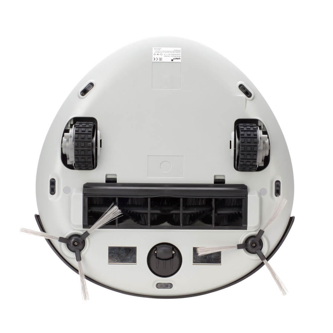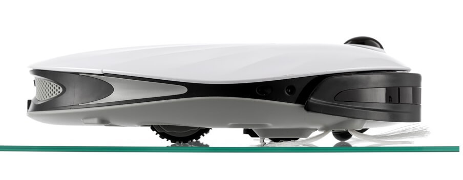 La parte trasera del dispositivo contiene almohadillas de contacto, una rueda giratoria delantera, dos ruedas laterales, dos cepillos laterales, un compartimento central para el cepillo y sensores de altura infrarrojos. Si desea fregar el suelo, coloque un accesorio especial para fregar en la parte inferior del robot aspirador, al que se fija un paño de limpieza con velcro.