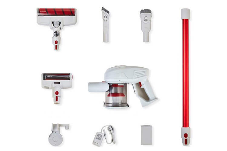 El paquete de la Xiaomi Jimmy JV51, además de la aspiradora inalámbrica, incluye cargador, adaptador de corriente, batería, tubo alargador, soporte de pared y manual de usuario. El dispositivo también incluye cuatro cepillos: una boquilla principal para suelos, un minicepillo turbo para tapicerías (apta para recoger suciedad y pelos de mascotas) y dos accesorios adicionales para limpiar zonas de difícil acceso.
