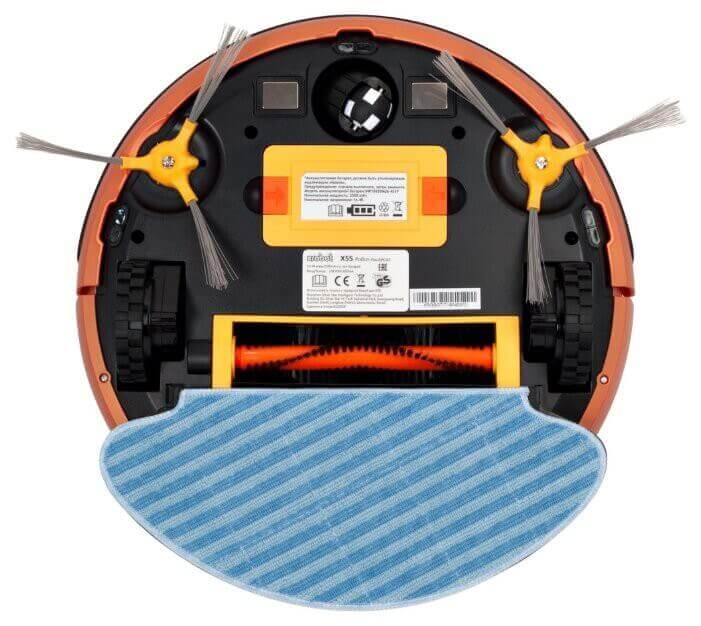 En la parte trasera del robot aspirador se encuentran las ruedas motrices laterales, una rueda universal, almohadillas de contacto para la recarga automática, un compartimento de batería, cepillos laterales y un cepillo turbo central.