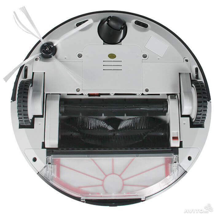 Abajo hay dos ruedas principales y un rodillo frontal que permite el giro del robot. Debajo de este rodillo hay una tapa que oculta el compartimento de la batería. Un cepillo lateral está fijado a un lateral. En el centro hay dos cepillos principales: uno para limpiar el centro y otro para el suelo. Detrás del cepillo hay un depósito de polvo. Para abrirlo, presione un botón especial y extraiga el depósito.
