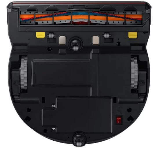 Una vista inferior del Samsung VR10M7030WW muestra un par de ruedas de tracción laterales, un rodillo frontal, un par de contactos de carga, un cepillo central asegurado con una cubierta especial con un botón, una tapa del compartimiento de la batería, sensores de borde y un interruptor de seguridad.
