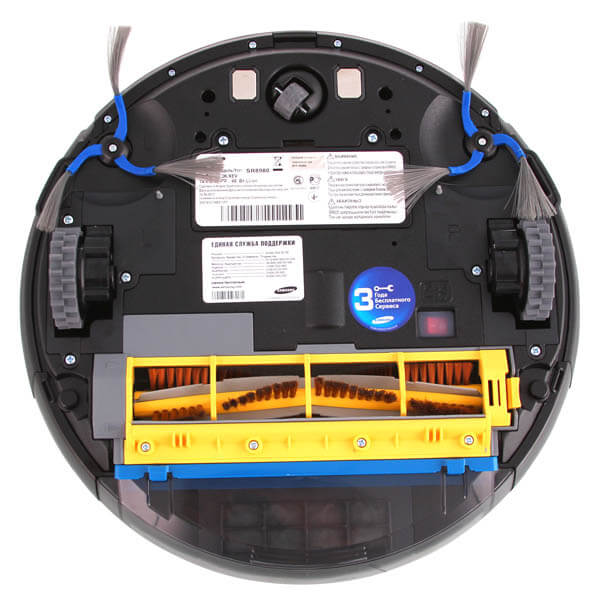 Jos katsot robottia alhaalta päin, näet kaksi pääkeskipyörää ja yhden eturullan, joka ohjaa robotin pyörimistä. Rullan molemmilla puolilla on kaksi sivuharjaa, ja niiden takana on akkulokero. Voit myös nähdä keltaisen pääharjan ja sen takana pölysäiliön pohjan.