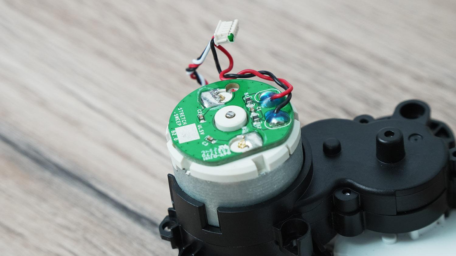 בואו נסתכל על ה-Dreame. לאחר הפירוק, לא נמצאה הלחמה פגומה, כפי ששונאים מרבים לציין ברשת. מעניין לציין שהעיצוב שונה. מותקנים שני מנועים. אחד, הקטן יותר, הוא מנוע מברשות ואחראי על הארכת מברשת הצד. השני, הגדול יותר, אחראי על הסיבוב.