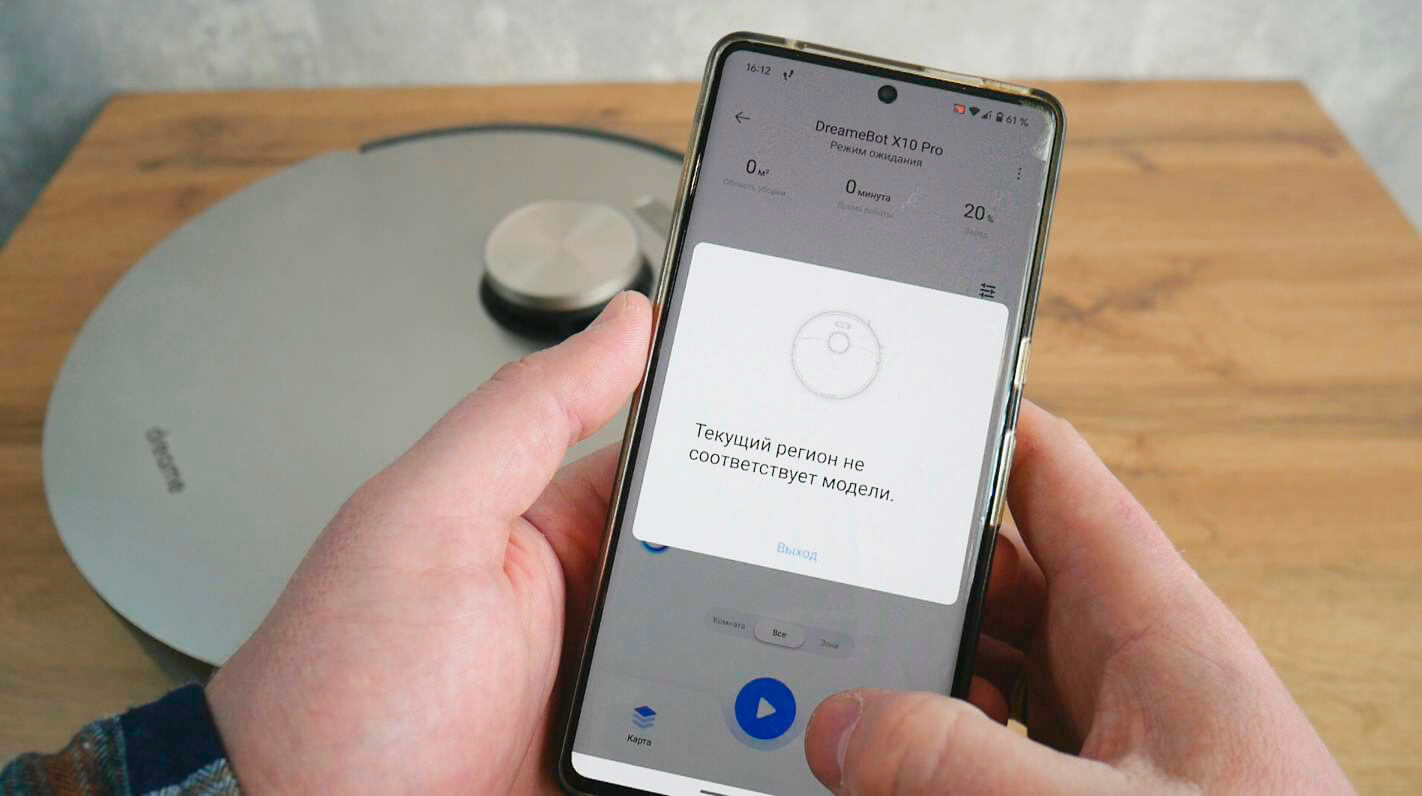 Dabar apie patį blokavimą. Įdiegiate programėlę, prijungiate robotą dulkių siurblį prie „Wi-Fi“ tinklo, sujungdami maršrutizatorių, išmanųjį telefoną ir patį robotą. Atidarius programėlę, spustelėjus pridėtą robotą, pasirodo pranešimas: „Dabartinis regionas neatitinka modelio“. Tai reiškia, kad nėra galimybės pasiekti nustatymų ir šiuo metu negalima naudoti greitojo paleidimo meniu mygtukų, pvz., paleisti automatinio valymo ar grąžinti robotą į jo stotį. Net valdymas per „Yandex.Alice“ nepalaikomas; bent jau aš negalėjau duoti robotui komandų, nors įtraukiau jį į „Išmaniųjų namų“ sąrašą. Paprastai robotas dulkių siurblys reaguoja tik į mechaninių mygtukų, esančių ant korpuso, paspaudimą. Kitaip tariant, jis pats save blokuoja, kaip sakoma.
