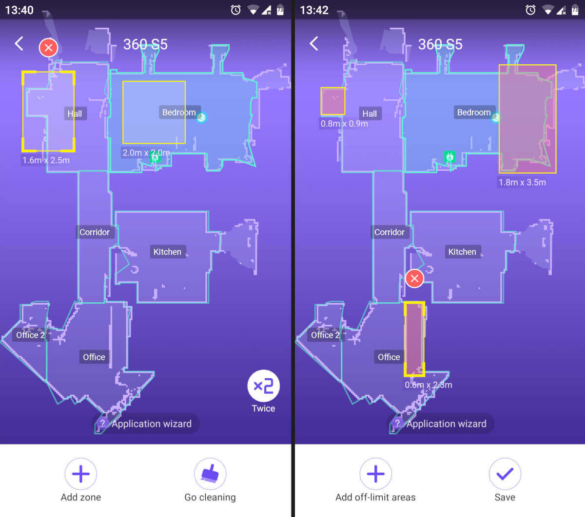 Kambario ribas galite keisti rankiniu būdu, sujungdami kelis kambarius į vieną arba, atvirkščiai, padaliję kambarį į papildomas zonas. Tai atveria keletą naudingų funkcijų. Pirmoji – roboto dulkių siurblio nukreipimas į norimą kambarį valymui, panašiai kaip ir zonos pasirinkimo funkcija, tik šiuo atveju vietoj zonos pasirinkimo stačiakampiu tiesiogiai pasirenkate norimą kambarį. Antroji funkcija – valymo grafiko nustatymas ne tik pagal laiką ir savaitės dieną, bet ir pagal kambarį. Pavyzdžiui, galite užprogramuoti robotą valyti virtuvę 8 val., svetainę – 9 val., o miegamąjį ir vaikų kambarį – 10 val., kai visi nemiega.