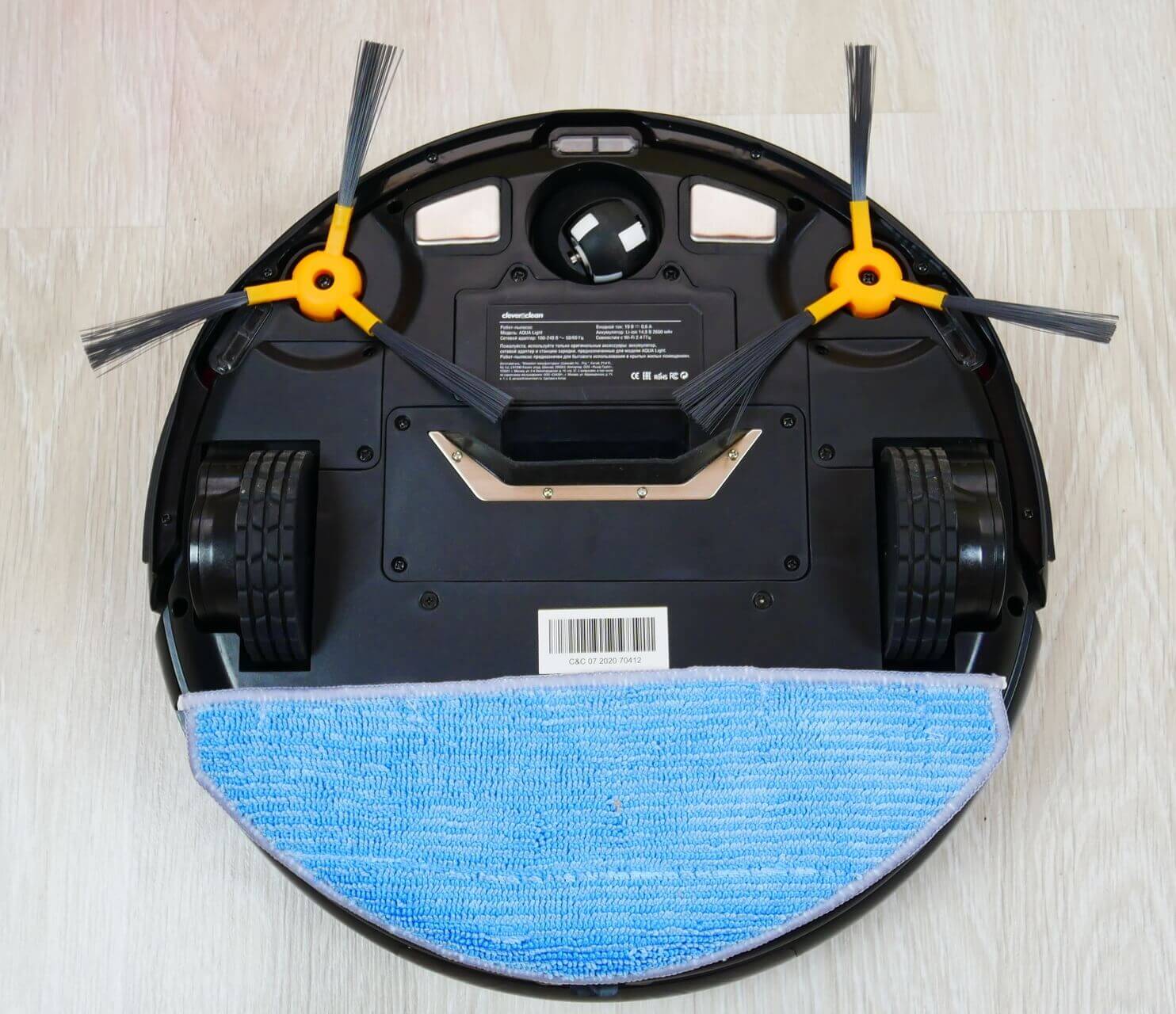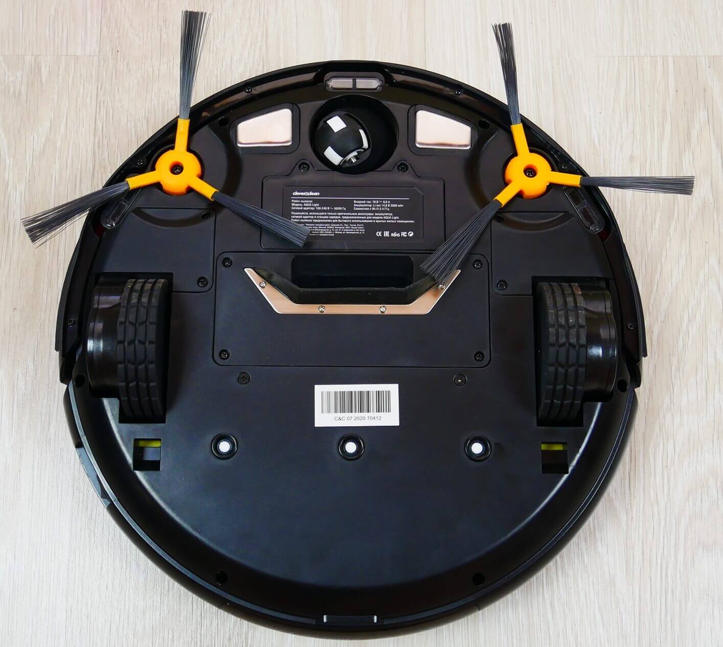 Apverskime korpusą ir pažiūrėkime, kaip „Clever&Clean AQUA Light“ suprojektuotas iš apačios. Matome du šoninius šepečius, spyruoklinius ratukus ir centrinę siurbimo angą. Centrinio turbošepečio nėra.
