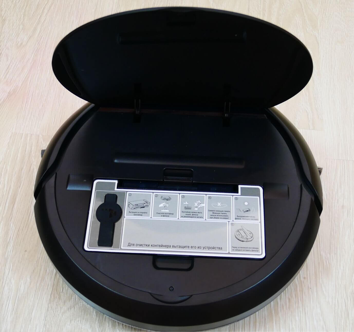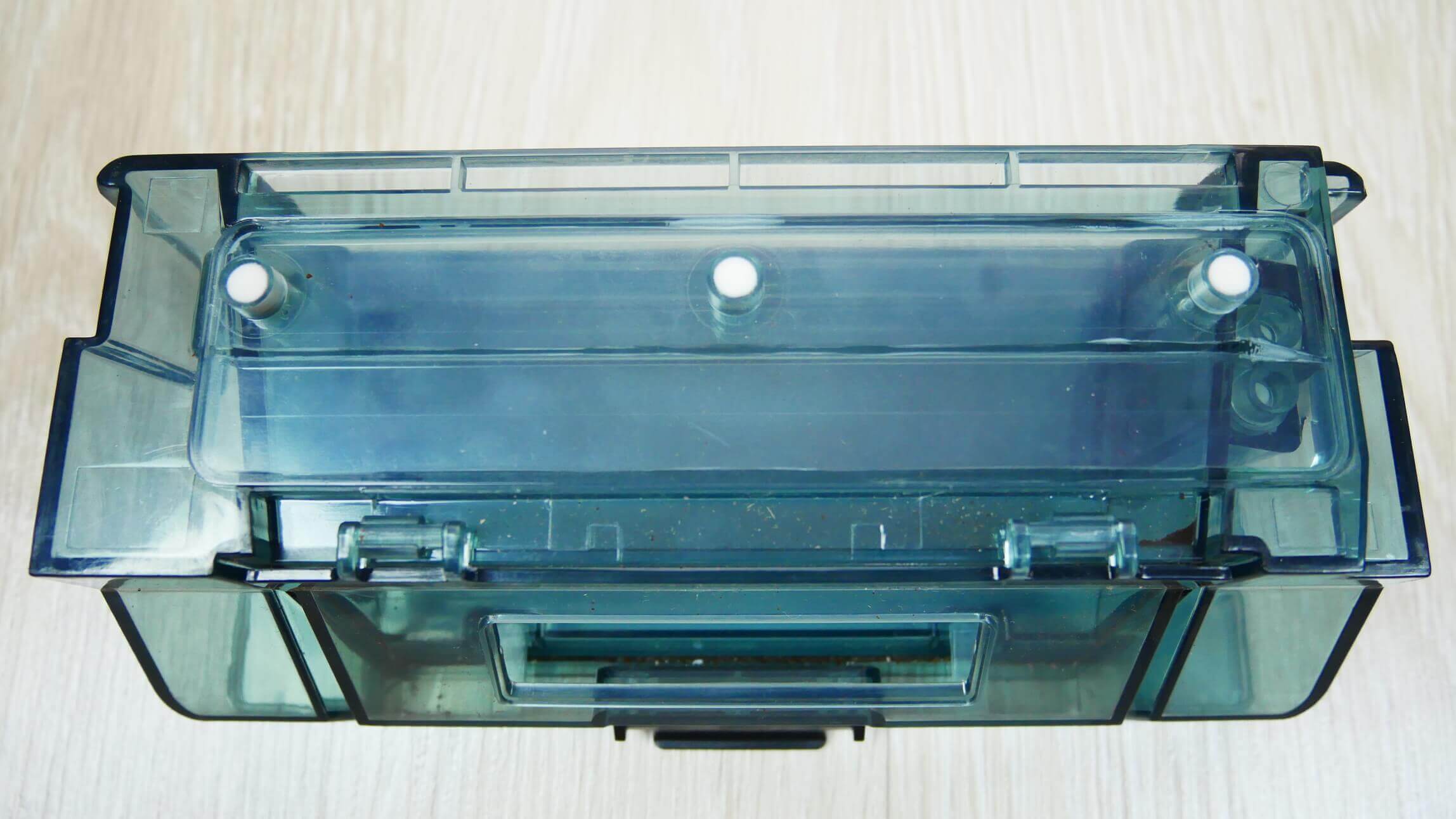 Dulkių surinktuvas atsidaro priekyje, kad būtų lengva jį valyti, tačiau nėra apsauginio atvarto, kuris neleistų iškristi šiukšlėms. Apačioje yra trys vandens įleidimo angos valymo šluostei. Vanduo nukreipiamas tiesiai į šluostės priekį; nėra galimybės reguliuoti drėgmės lygio.