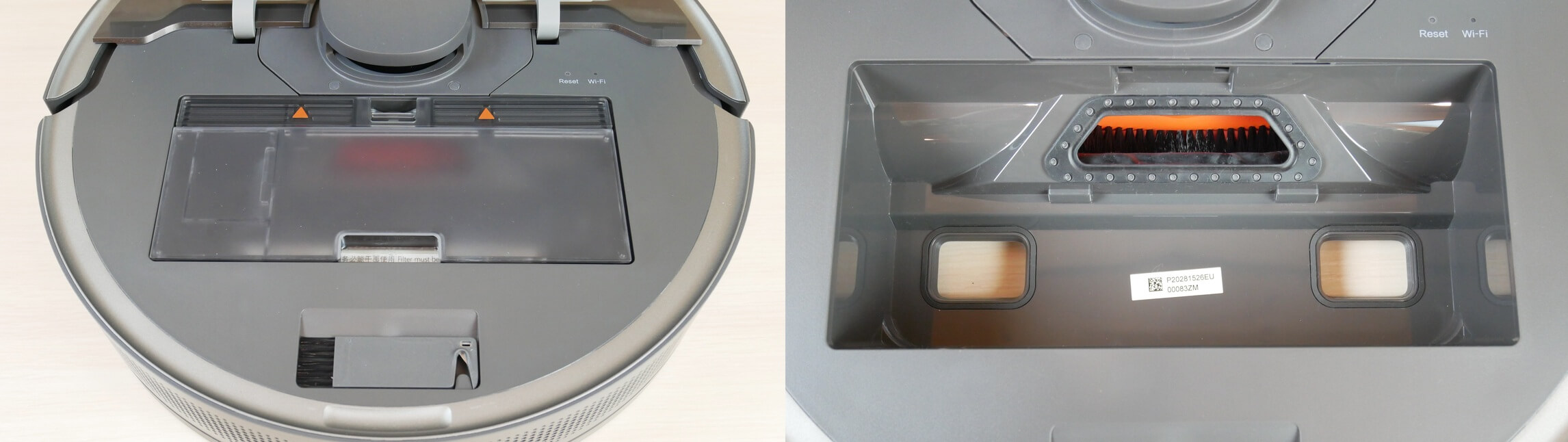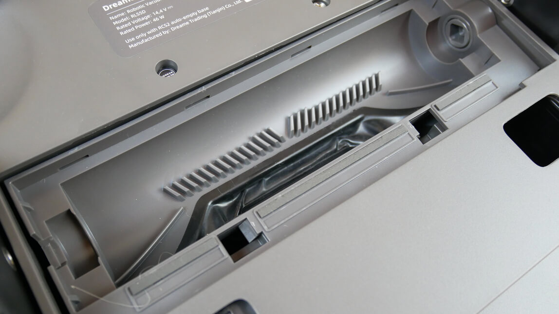 Dulkių surinktuvas yra po viršutiniu dangčiu. Šalia jo matome roboto valymo įrankį. Svarbu tai, kad po dulkių surinktuvu yra dvi angos. Per jas šiukšlės patenka į savaiminio valymo stotelės siurbimo kanalą. Tai rodo, kad anksčiau išleistas „Dreame Bot L10 Pro“ negalės savaiminio valymo stotelėje, nes jame šių angų nėra.