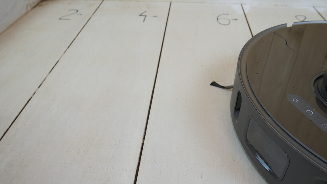 Na, štai kur mane užklupo gana nemaloni staigmena. Robotas dulkių siurblys sugebėjo išsiurbti šiukšles iš 2 mm gylio tarpo, o atidžiau įsižiūrėjus, jam pavyko surinkti šiek tiek šiukšlių iš 4 mm gylio tarpo.