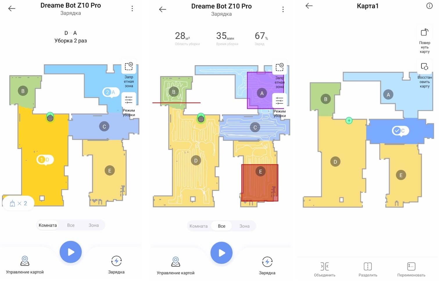 Žemėlapio valdymo skiltyje, esančioje apačioje kairėje, galite pasirinkti vieną iš išsaugotų žemėlapių. Beje, „Dreame Bot Z10 Pro“ saugo iki trijų unikalių žemėlapių. Dirbdami su žemėlapiu, taip pat galite sujungti kelis kambarius į vieną, padalinti kambarius į atskiras zonas ir suteikti šiems kambariams pavadinimus.