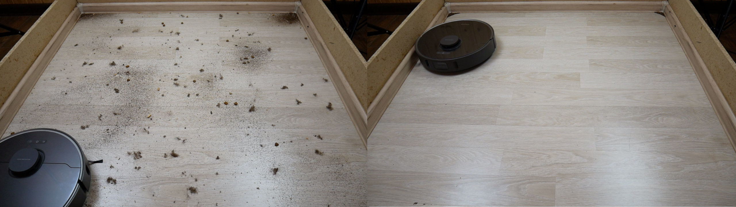 Laminuotų grindų cheminis valymas buvo įspūdingas. Robotas dulkių siurblys sugebėjo pašalinti visas šiukšles nuo grindų, įskaitant naminių gyvūnėlių plaukus ir kailį. Liko neišvalyti tik kampai.