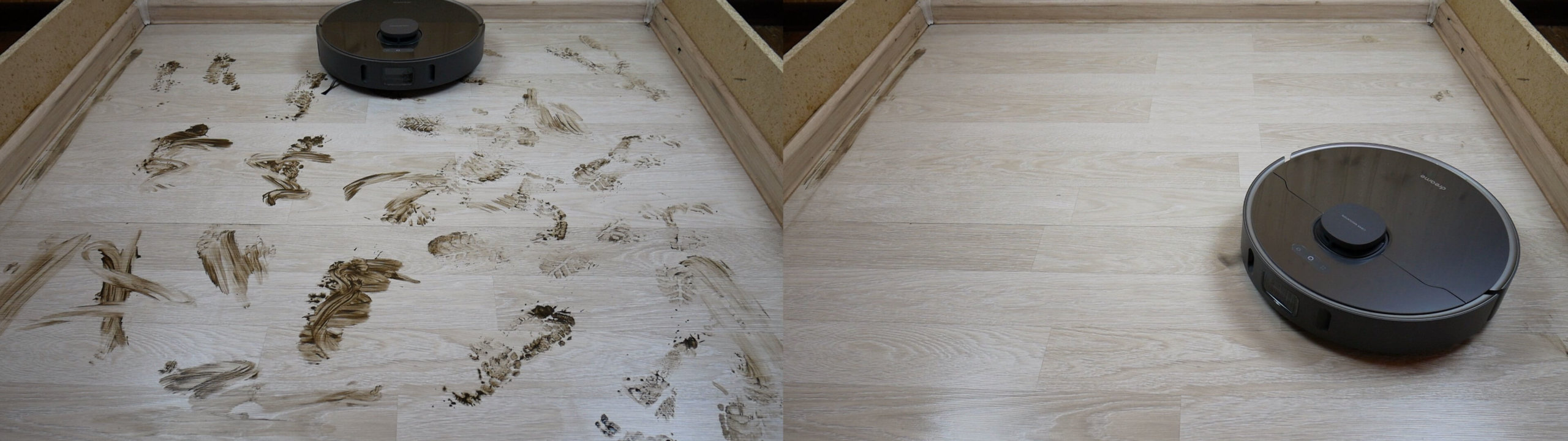 Šlapias valymas taip pat pasirodė esąs nepriekaištingas. „Dreame Bot Z10 Pro“ pašalino pridžiūvusius nešvarumus nuo grindų nepalikdamas dryžių. Mažas nešvarumų ruožas liko palei grindjuostę, tačiau tai buvo būdinga visiems kitiems panašiems išbandytiems įrenginiams.