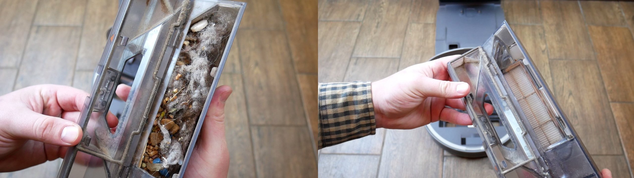 Taip pat parodysiu, kaip gerai „Dreame Bot Z10 Pro“ išsivalo savaime. Matote, kad pradinėje būsenoje dulkių konteineris beveik visiškai prisipildęs įvairių rūšių šiukšlių. Tačiau po savaiminio valymo konteineryje visiškai neliko jokių šiukšlių. Stotis atlieka savo darbą puikiai. Testas sėkmingas!