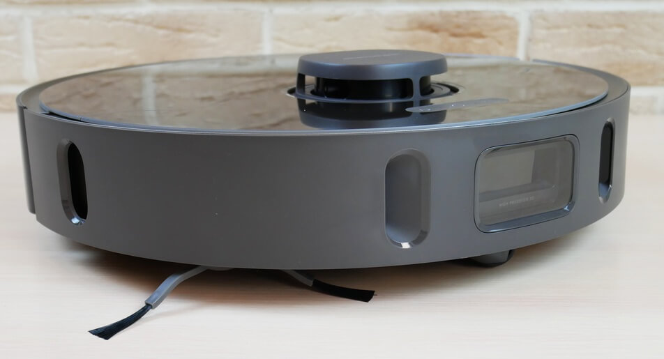 Pažvelkime į „Dreame Bot Z10 Pro“ dizainą. Jis turi tradicinę apvalią formą. Jis yra tamsiai pilkos spalvos, o ne juodos, kaip jo pirmtakas. Jis atrodo praktiškesnis ir ant jo mažiau matosi pirštų atspaudai. Robotas dulkių siurblys yra maždaug 97 mm aukščio.
