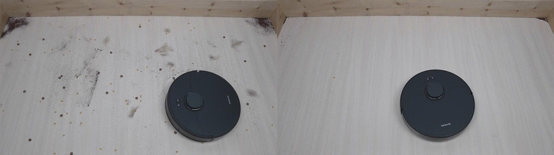 Įvairių rūšių šiukšlių surinkimo kokybė nuo laminuotų grindų yra gera. Kampuose, kur nepasiekia apvalūs robotiniai dulkių siurbliai, lieka tik šiek tiek šiukšlių. Taip pat svarbu atkreipti dėmesį, kad centrinis šepetys nesurenka jokių naminių gyvūnėlių plaukų ar kailio. Tai yra pagrindinis silikoninių šepečių privalumas! Visos šiukšlės surenkamos į dulkių konteinerį.