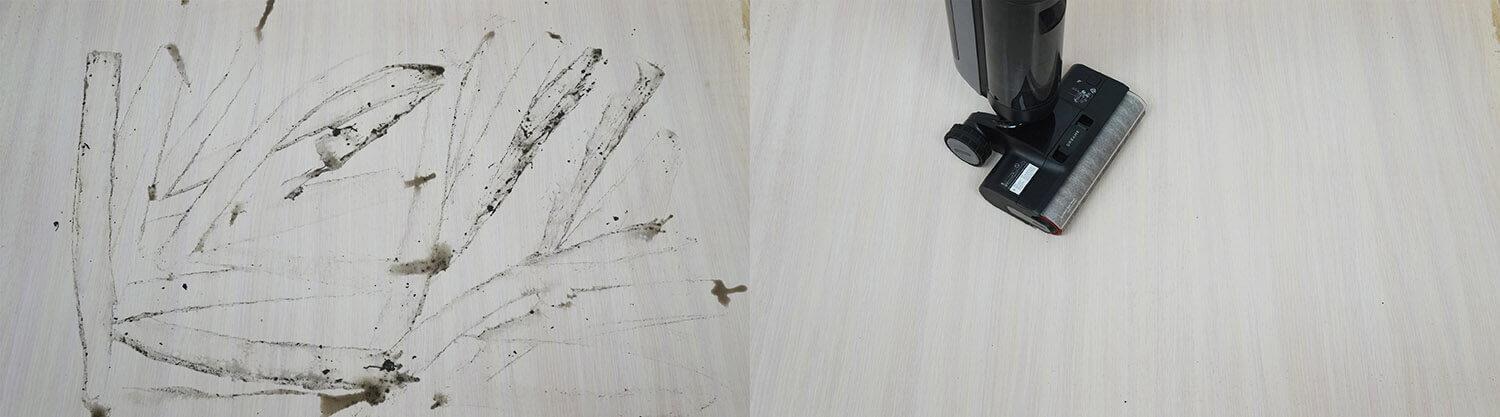 „Dreame H13 Pro“ taip pat galima naudoti šiek tiek pridžiūvusiems nešvarumams valyti. Kaip matote, nepalieka jokių žymių ar dryžių. Grindys tampa idealiai švarios.