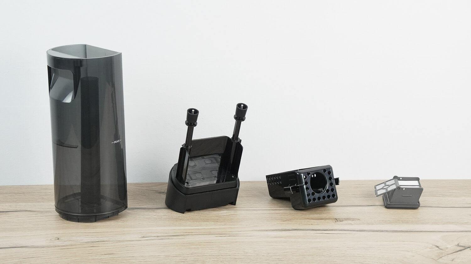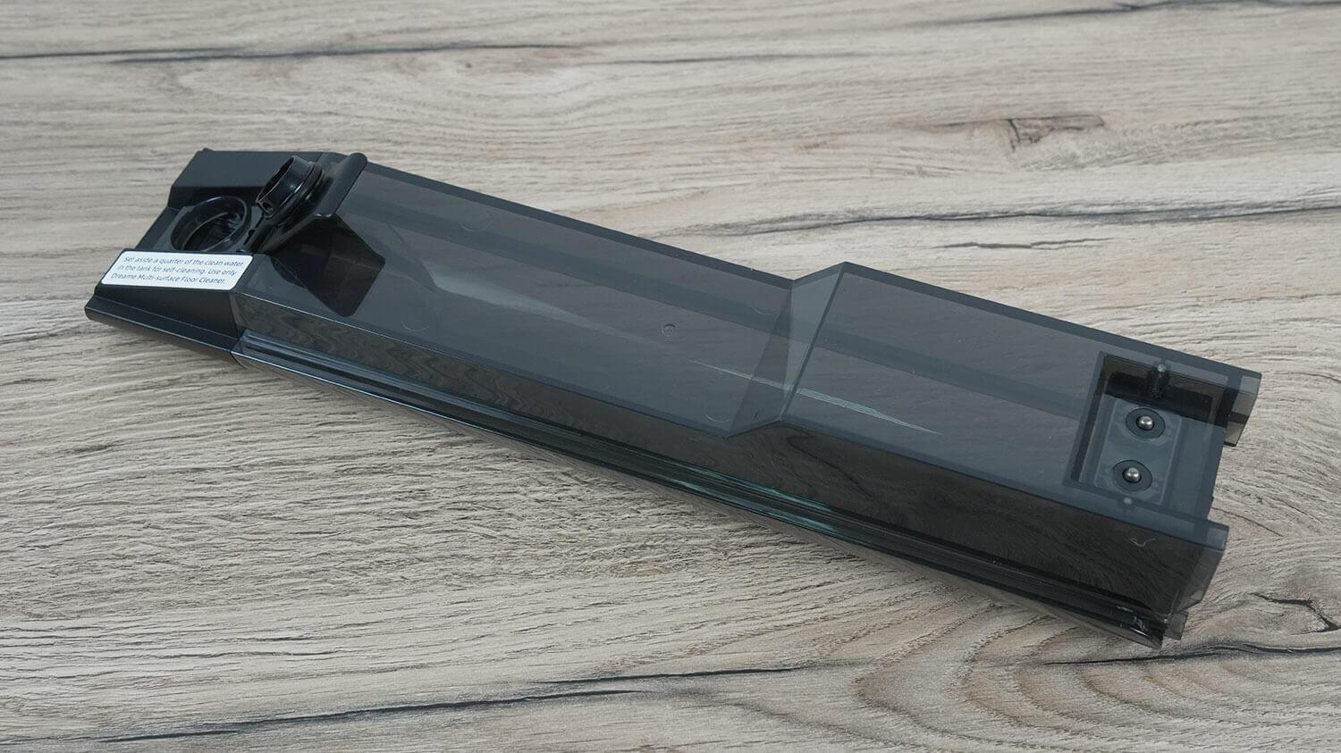 Virš valymo modulio yra nešvaraus ir švaraus vandens bakas. Nešvaraus vandens bake yra HEPA filtras su tinkleliu, elektroniniai vandens lygio jutikliai ir galiausiai šiurkštus filtras, kuris sulaiko dideles šiukšles. Beje, šio bako talpa yra 700 ml.