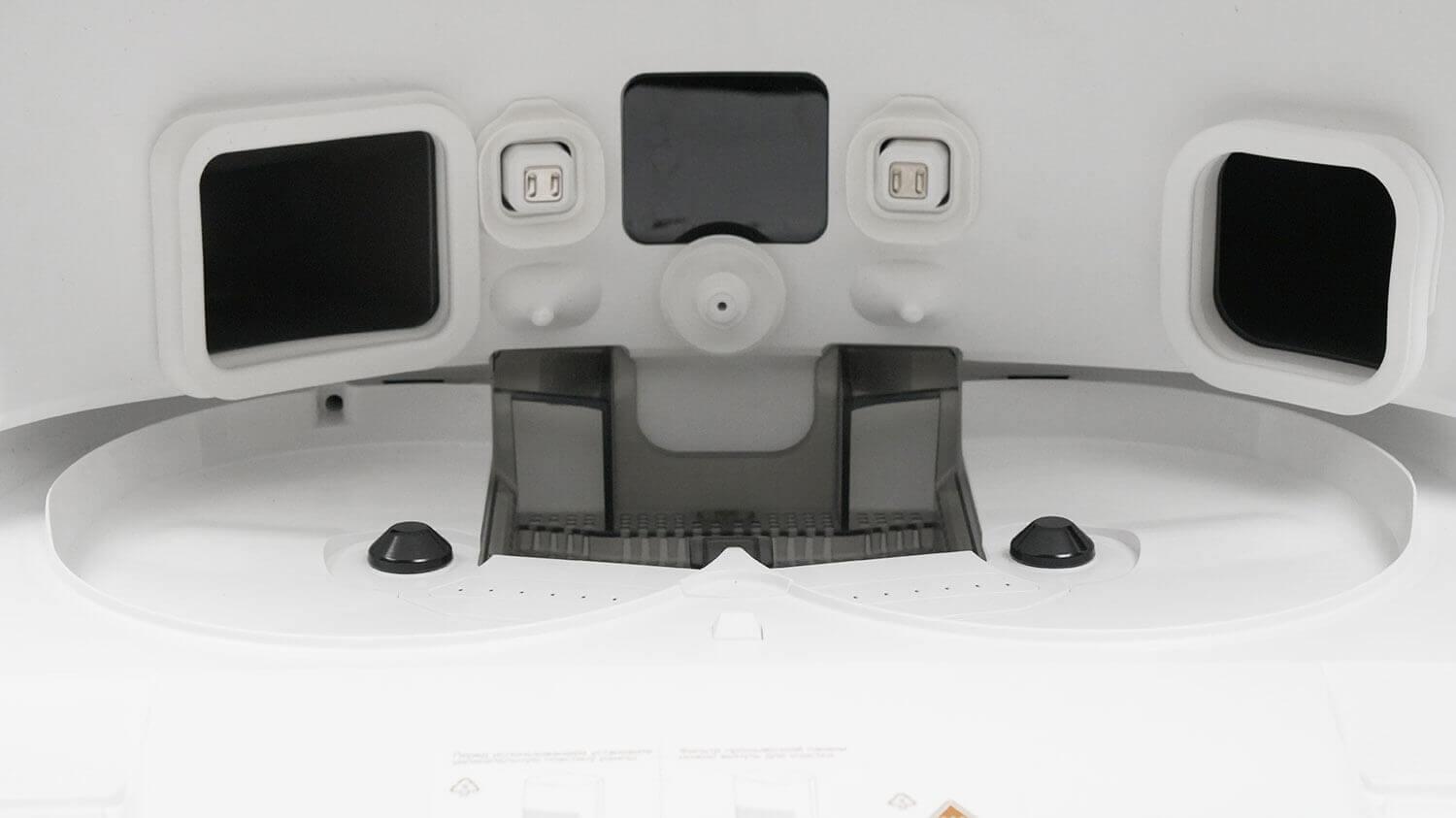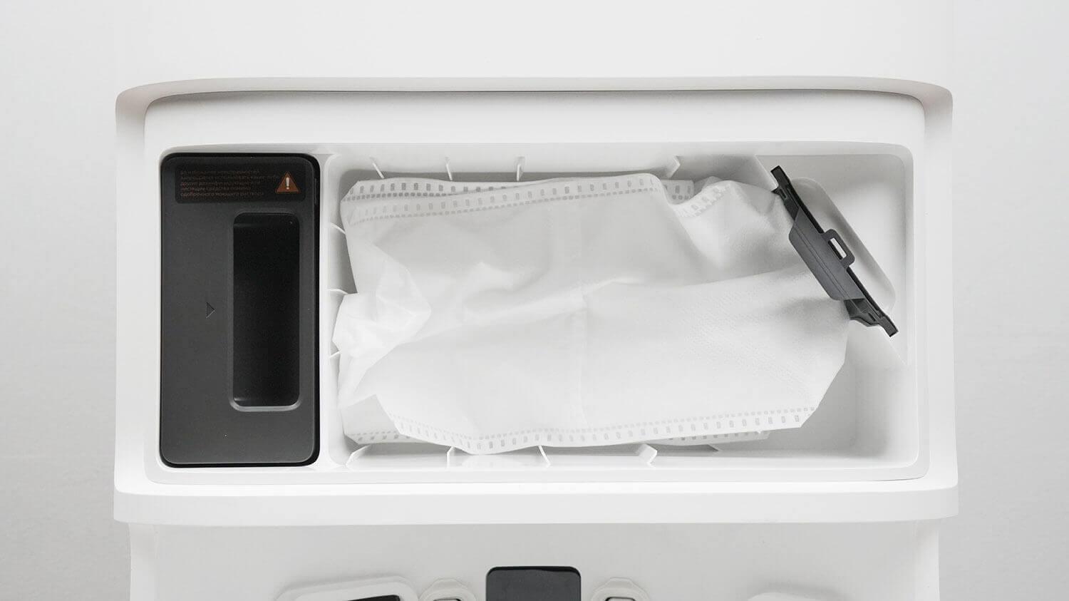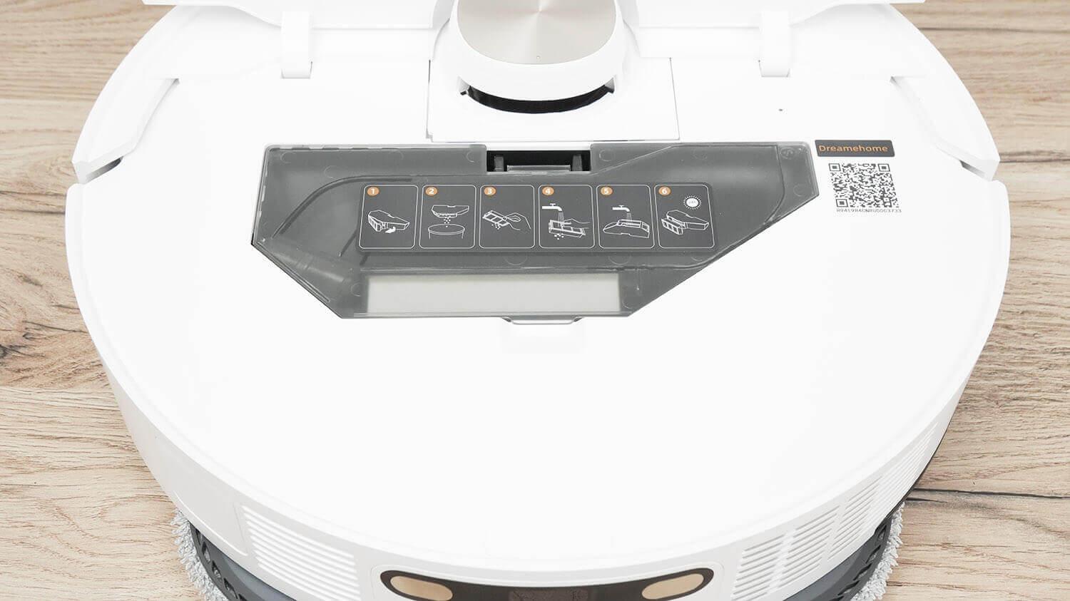 Dulkių talpykla ir QR kodas, skirtas robotui prijungti prie „Wi-Fi“ tinklo, yra po viršutiniu dangteliu. Dulkių talpyklos talpa – 310 ml. Filtravimo sistemoje naudojamas plaunamas HEPA filtras. Vandens bakas yra paslėptas korpuso viduje ir automatiškai užpildomas stotelėje.
